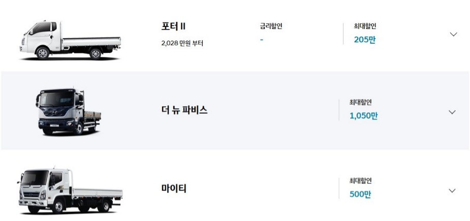 상용차종 : 더 뉴파비스(최대할인 1,050만), 마이티(최대할인 500만)