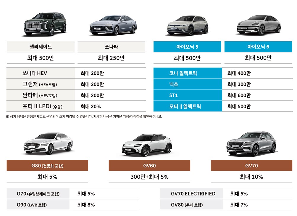 수소/전기차 모델 : ST1(최대할인 705만), 넥쏘 (최대할인 560만) , 코나 Electric (최대할인 775만) , 아이오닉 6 (최대할인 870만) , 더 뉴 아이오닉 5(최대할인 870만) , 포터 II Electric (최대할인 805만)